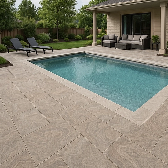 Era Porcelain showcases the mesmerizing flow of natural stone patterns, blending striking grey tones with elegant movement to create a statement look. Its sophisticated veining and layered textures bring a luxurious, high-end appeal to any outdoor or indoor space.